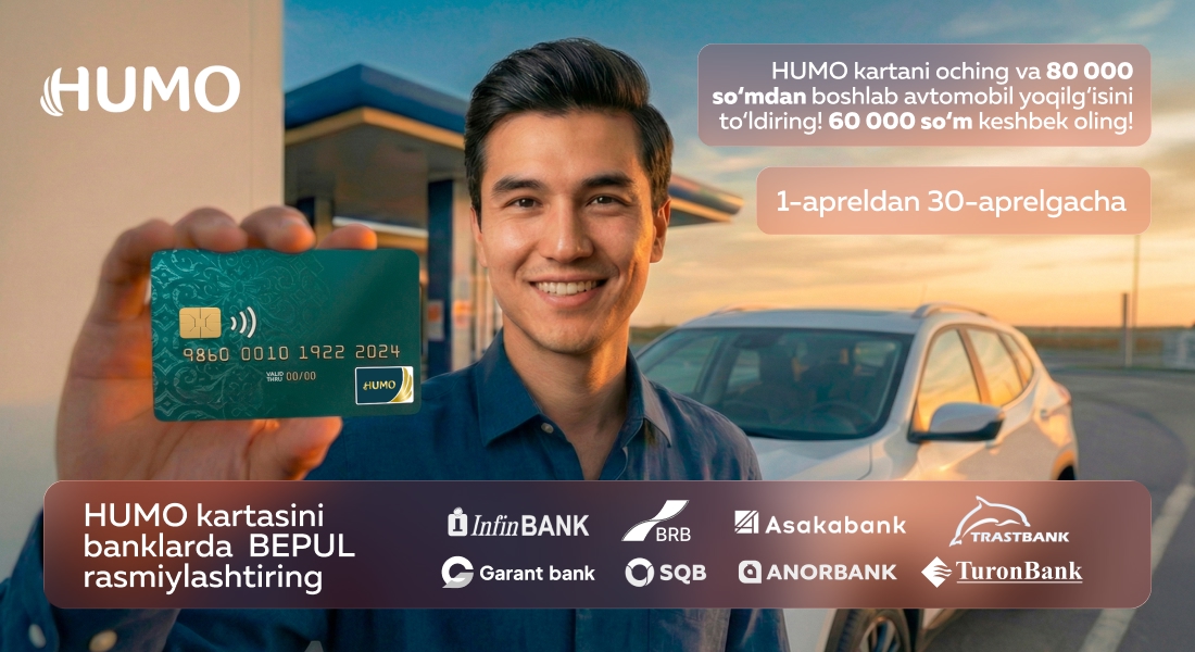 Yoqilg‘i doimiy xarajatlar toifalaridan biri bo‘lib, bu segmentda qo‘shimcha qo‘llab-quvvatlashni yo‘lga qo‘yish foydalanuvchilarning naqdsiz to‘lov shakliga yanada jadalroq o‘tishlariga xizmat qiladi. HUMO kartalarini hamkor-banklarda, jumladan SQB, Trastbank, Garant bank, Turonbank, Infinbank, Anorbank, BRB va Asaka bank'da BEPUL rasmiylashtirish mumkin.